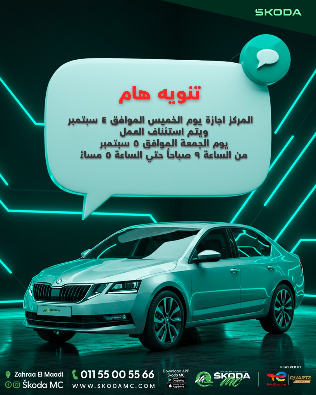 سكودا معادي سنتر.. الخميس الموافق ٤ سبتمبر اجازة 🎉 مستنيكم يوم الجمعة الموافق ٥ سبتمبر في مواعيدنا من الساعة ٩ صباحا حتي الساعة ٥ مساء سكودا معادي سنتر.. مركز الثقة