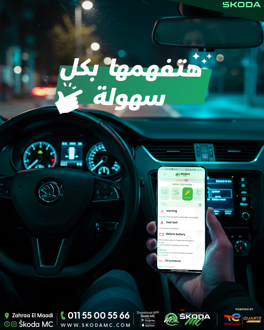 الرعب الحقيقي لما تلاقي لمبة نورت في التابلوه وانت مش عارف اية دي .. لكن لو حملت ابليكيشن سكودا معادي سنتر ، مفيش رعب تاني لان كل لميات التابلوه موجودة تقدر تتعرف علي كل واحدة بتعمل اية وتتصرف ازاي في الاعطال البسيطة وكمان تقدر تعرف النصائح بالفيديو علشان نسهلها عليك .. الابليكيشن .. أسهل ، أسرع سكودا معادي سنتر .. مركز الثقة